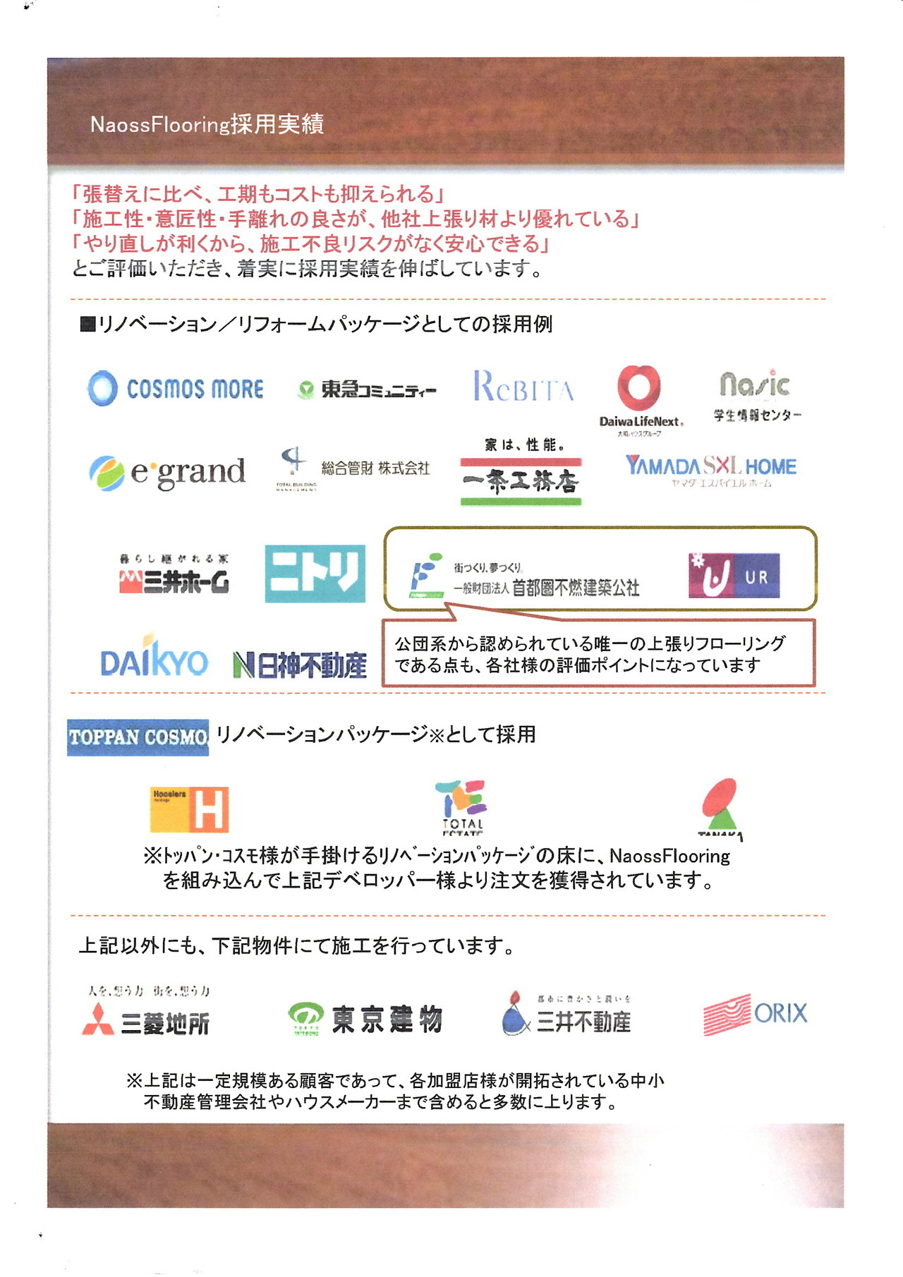 ③フローリング、塩ビタイル、CFの上から直接貼れるので対応できる案件が多い!